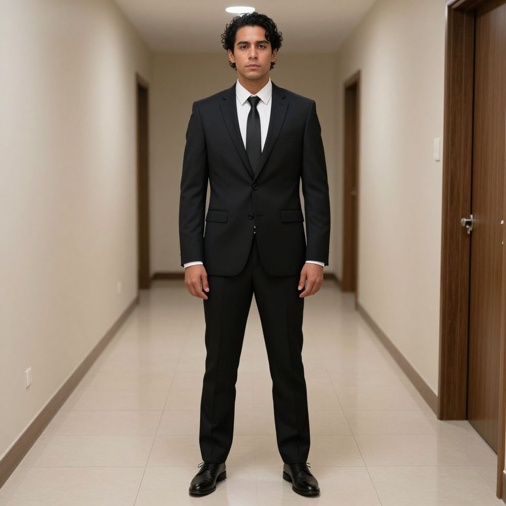 Photograph of a young man with medium brown skin and curly black hair standing in a brightly lit, beige-tiled hallway. He is wearing a black suit with a white dress shirt and black tie. His black leather shoes are polished. The hallway has white walls, brown wooden doors on both sides, and a brown baseboard running along the floor. The lighting is even, casting no shadows, and the man stands centered in the frame, looking directly at the camera with a neutral expression.