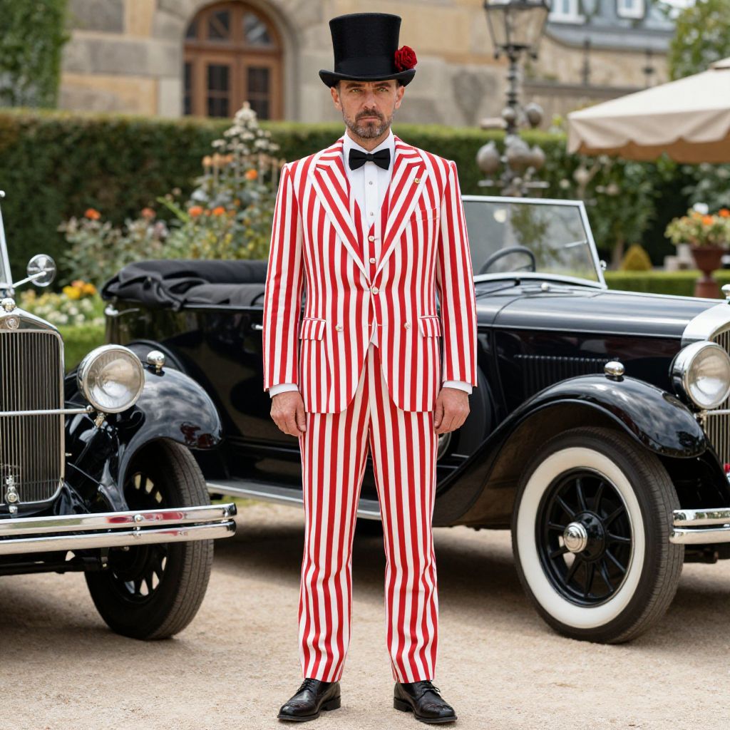 A distinguished man in his 40s with a sharp facial structure, calm green eyes, and a neatly trimmed beard stands confidently in a classic 1920s-style setting. He wears a red and white striped suit with a black bow tie, a crisp black top hat adorned with a vibrant red rose, and polished leather shoes. The scene is set in a sunlit garden with vintage cars and ornate architecture in the background, evoking a sense of elegance and timeless charm.