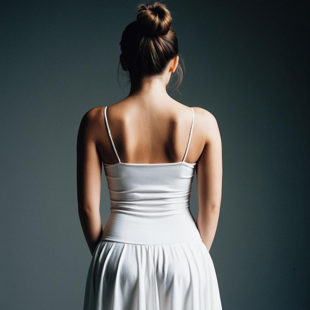 Dancewear tops,1girl, solo, realistic, dress, hair bun, brown hair, single hair bun, white dress, arms behind back, breasts