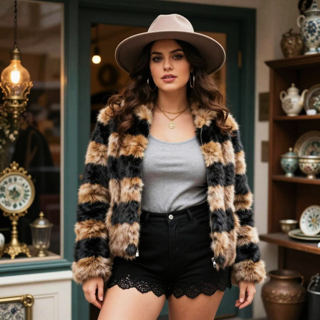 A Curvy woman in a boho-chic style, wearing a striped faux fur jacket in black and tan, a chunky grey tank top, lace-trimmed black shorts, and a taupe felt wide-brimmed hat, stands in a vintage boutique in a French quarter, surrounded by eclectic decor and charming displays, embodying the whimsical essence of studio pierrot. Sexy. Pretty face and beutiful eyes