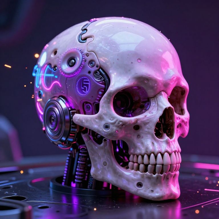 Photorealistic CGI image of a white, glossy, cybernetic skull with intricate gears and glowing blue and pink neon lights on the left side, set against a dark, blurred background. The skull has a metallic texture with visible screw holes and a robotic joint at the neck. The neon lights create a futuristic, sci-fi ambiance, with light reflections on the glossy surface. The skull's teeth are perfectly aligned, and its eye sockets are hollow, adding a haunting yet fascinating aesthetic.