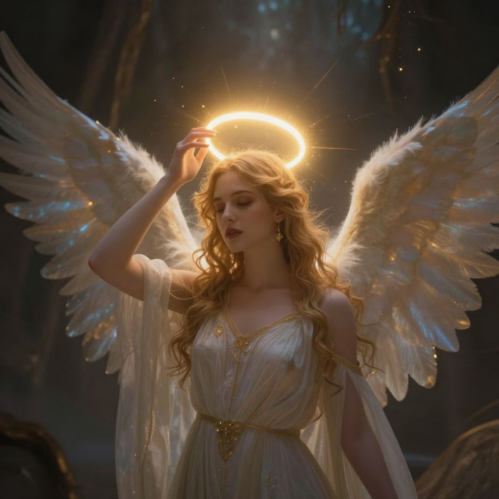 A celestial being with ethereal wings gently places a radiant, golden halo upon a woman's head, illuminating her in a mystical glow against a shadowy, dreamlike backdrop.