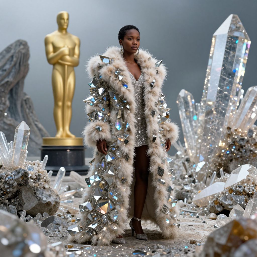 Photograph of a Black woman standing in a glittering, futuristic landscape. She wears an opulent, floor-length fur coat adorned with shimmering white fur, blue, and silver sequins. The coat is open, revealing a nude bodysuit. She has a sparkling headpiece and silver high heels. In the background, a golden Oscar statue stands on a pedestal, surrounded by glowing, crystalline structures. The scene is illuminated by a mixture of natural and artificial light, creating a celestial, glamorous atmosphere. The woman's confident stance and the luxurious ensemble dominate the composition.