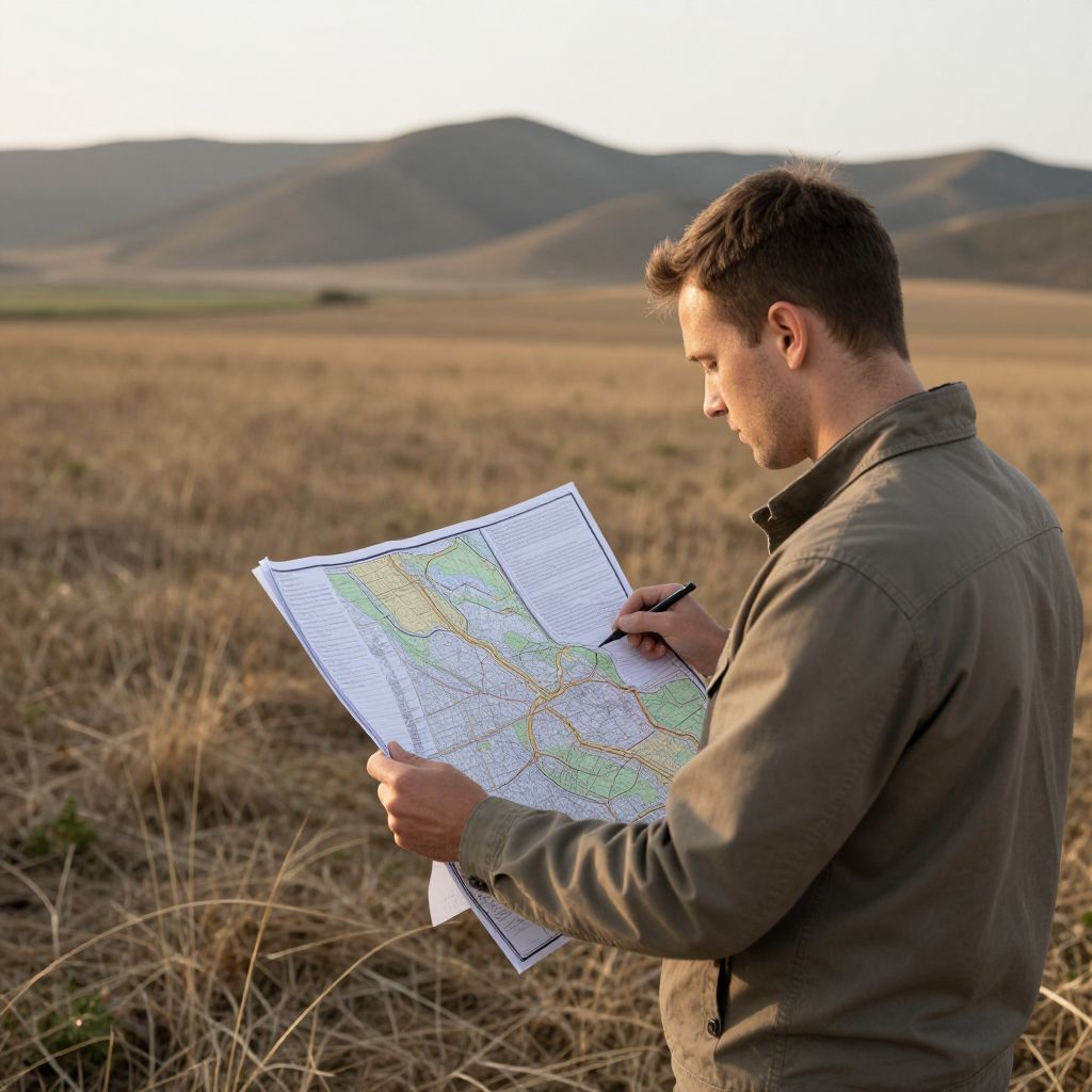 Landman surveying vast open fields with detailed maps and documents, rugged terrain in the background, soft golden hour lighting, realistic style, focused on land acquisition and exploration themes