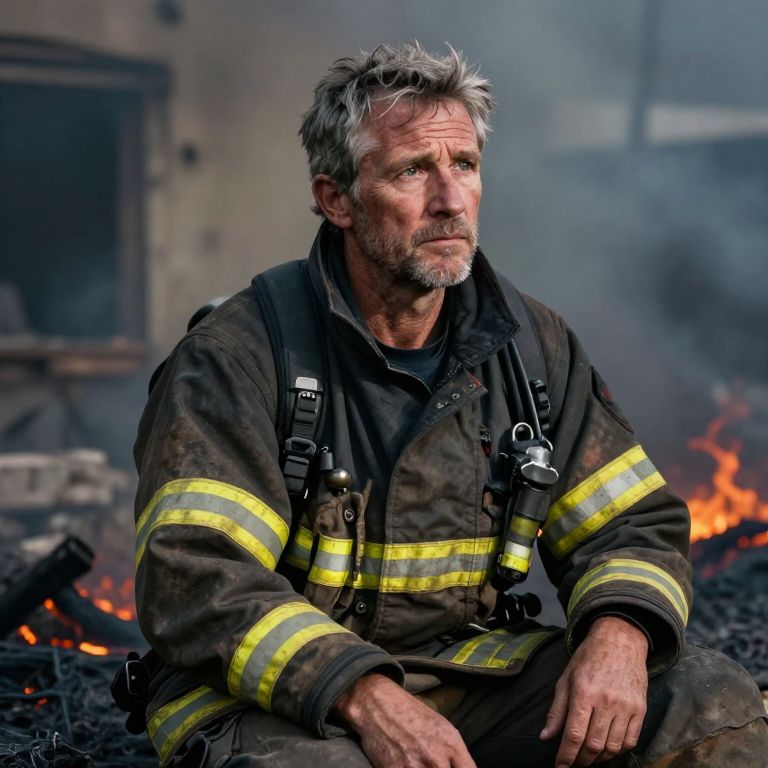 A photorealistic portrait captures a seasoned firefighter in his mid-forties, his rugged features framed by graying hair. Seated contemplatively amidst smoldering ruins, soft studio lighting highlights his weary yet resolute expression, gazing into the distance with an emotional gradient of weariness and determination. The detailed texture of his soot-stained uniform and weathered face adds to the realistic portrayal, depicting a hero reflecting on past trials and future challenges.