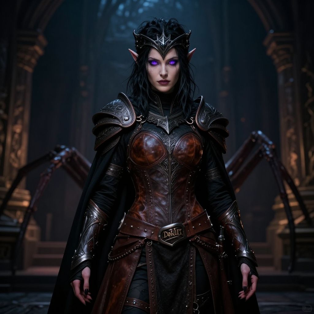 (masterpiece:1.2), (best quality, :1.2), 8k, HDR, ultra detailed, ((photorealistic)), perfect anatomy, professional light, cinematic lighting, fashion photography, ambient lighting, Angelina, as a beautiful female darkelf warrior of the evil spider goddess, violet eyes, ((cowboy shot)), messy hair, headdress, wearing intricate darkelf armor, leather armor, chain armor, bracers, and black cape, belt, DarElAr, in a fantasy underground! magical temple, ((perfect hands)), in the style of Warhammer fantasy, DonM3lv3nM4g1c, epiCPhoto