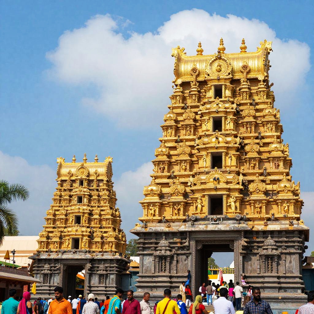 Photograph of a vibrant Indian temple scene. The image showcases two intricately carved, golden-brown gopurams (towering temple gateways) against a bright blue sky with fluffy white clouds. The larger gopuram dominates the center, adorned with detailed sculptures, while the smaller one stands to the left. Crowds of people, dressed in colorful traditional attire, gather at the base, adding lively energy to the scene.