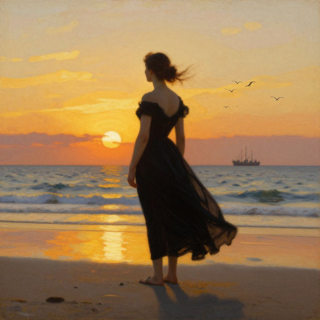 A digital painting depicts a silhouette of a woman with a slender build, wearing a flowing black dress, standing barefoot on a beach at sunset. Her dark hair is windswept. The vibrant orange and yellow sky reflects on the gentle waves, with a ship in the distance and birds flying. The sand beneath her feet is wet, and small pebbles are scattered. The overall mood is serene and reflective.