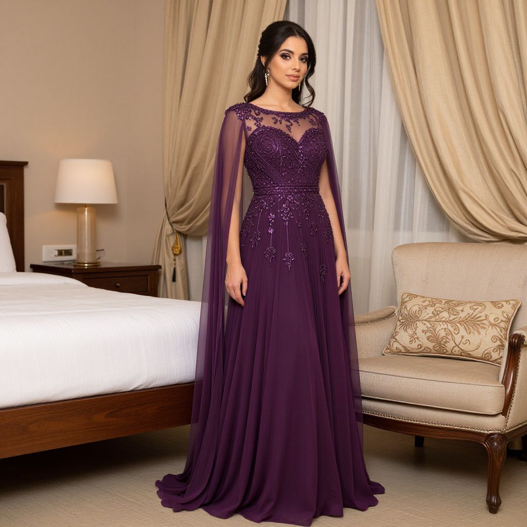 Elegantly draped in a plum-colored bridal gown adorned with intricate embellishments and a sheer cape, a woman stands poised in a warmly lit room featuring a wooden bed with white linens to her left and a cushioned chair with a decorative pillow to her right, framed by soft beige curtains.