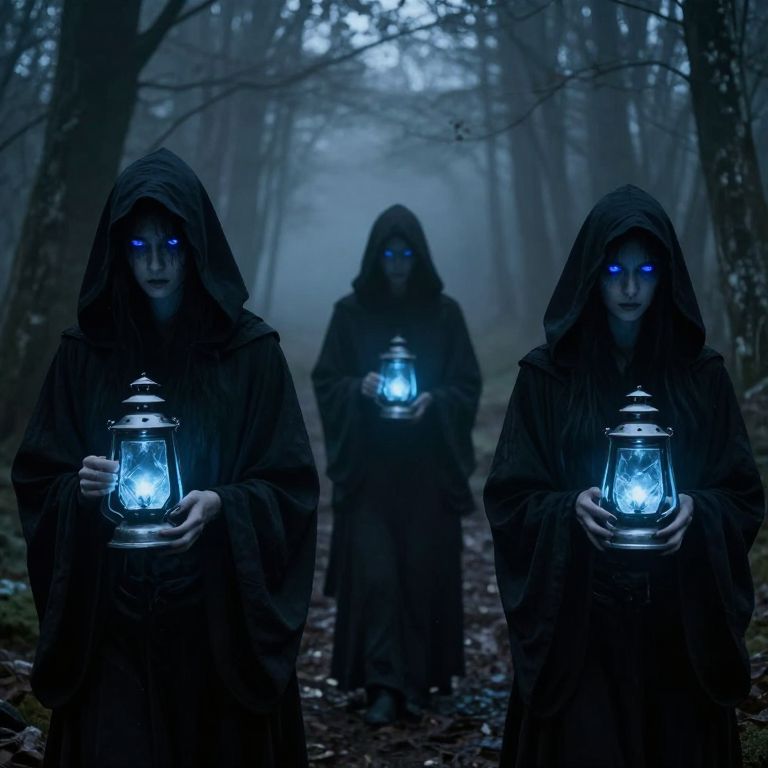Silent sentinels cloaked in shadow and hooded mystery traverse a spectral forest, their piercing blue eyes glowing like icy lanterns amidst the misty, otherworldly gloom.