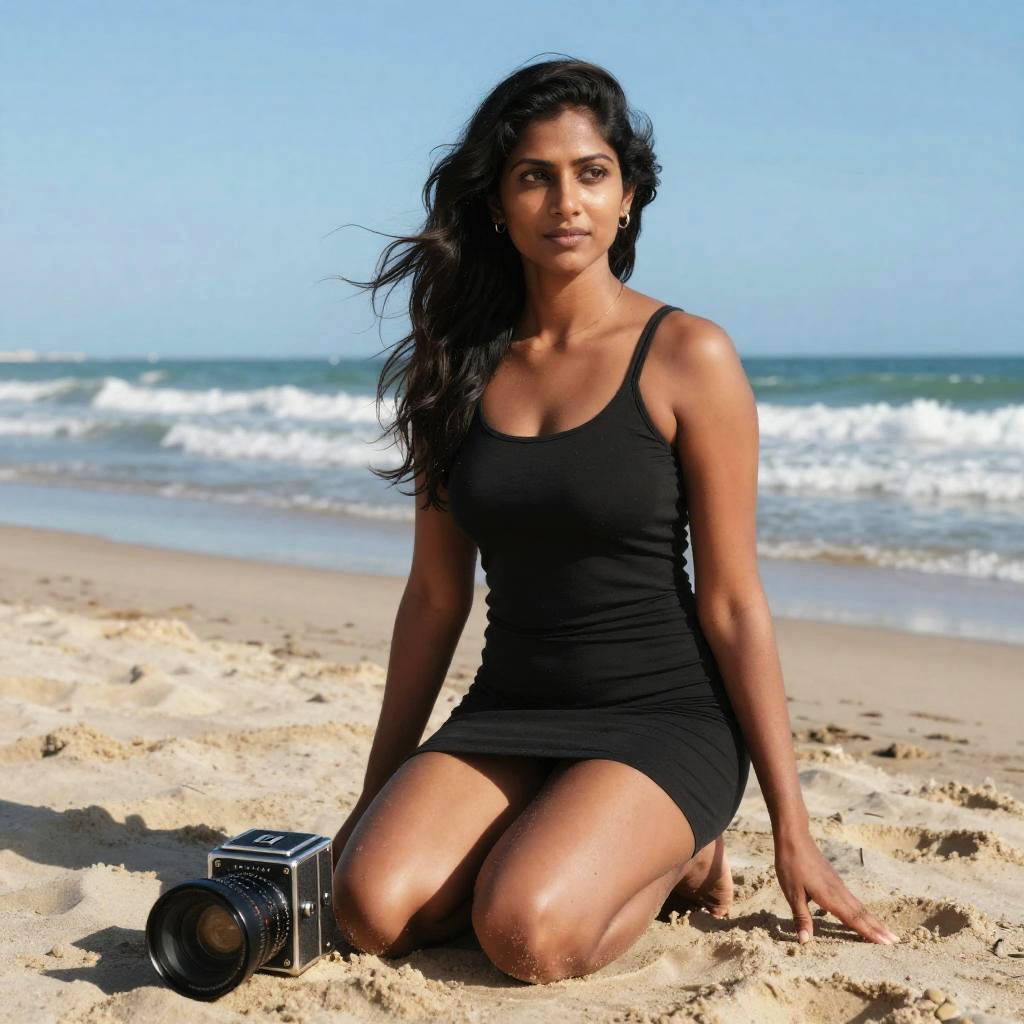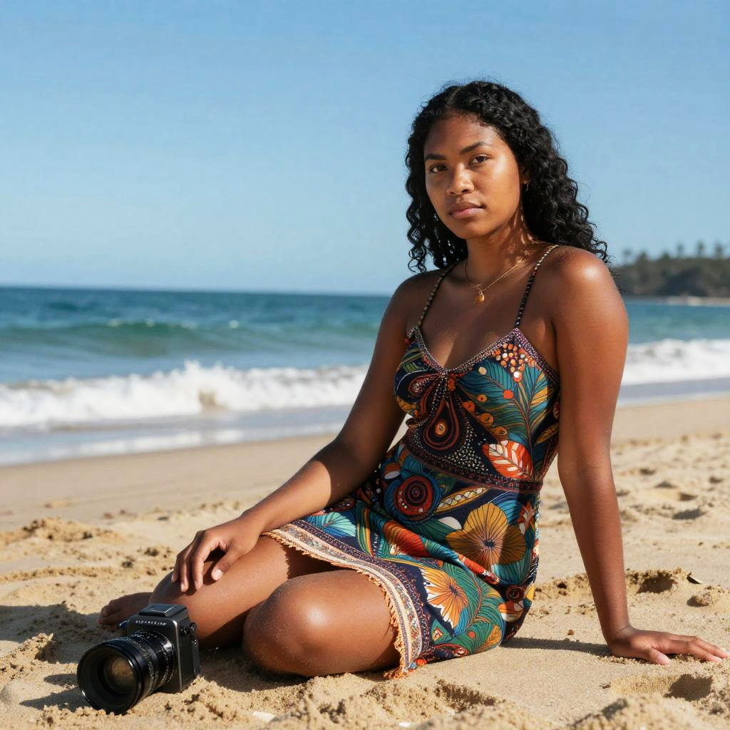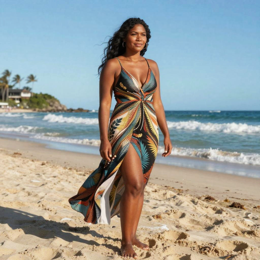A woman of 26 years, North African lady, in South Beach, low dress, hyper-photorealistic, shot on Hasselblad, 35mm lens, sharp focus, vibrant lighting, octane render, natural sunshine