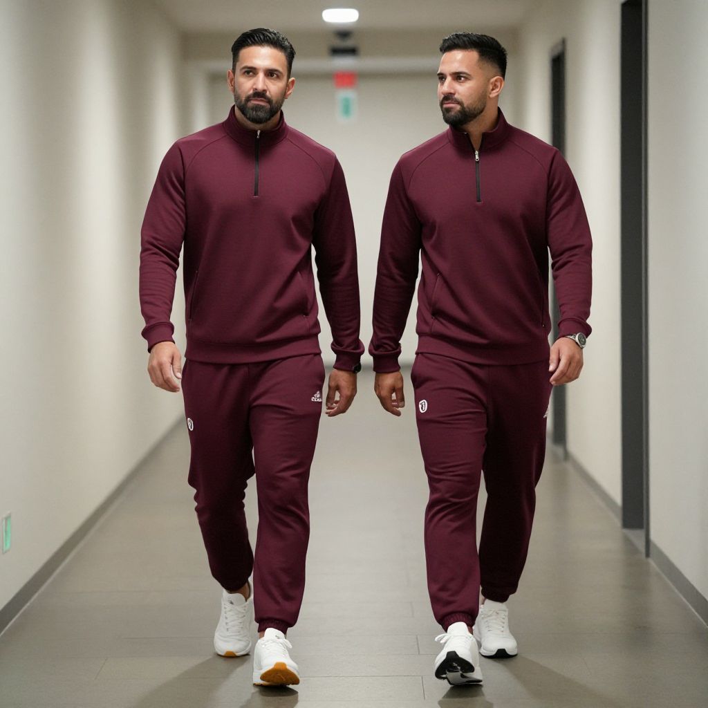 Photograph of two bearded men with dark hair, wearing maroon track suits and white sneakers, walking down a bright, empty hallway.
