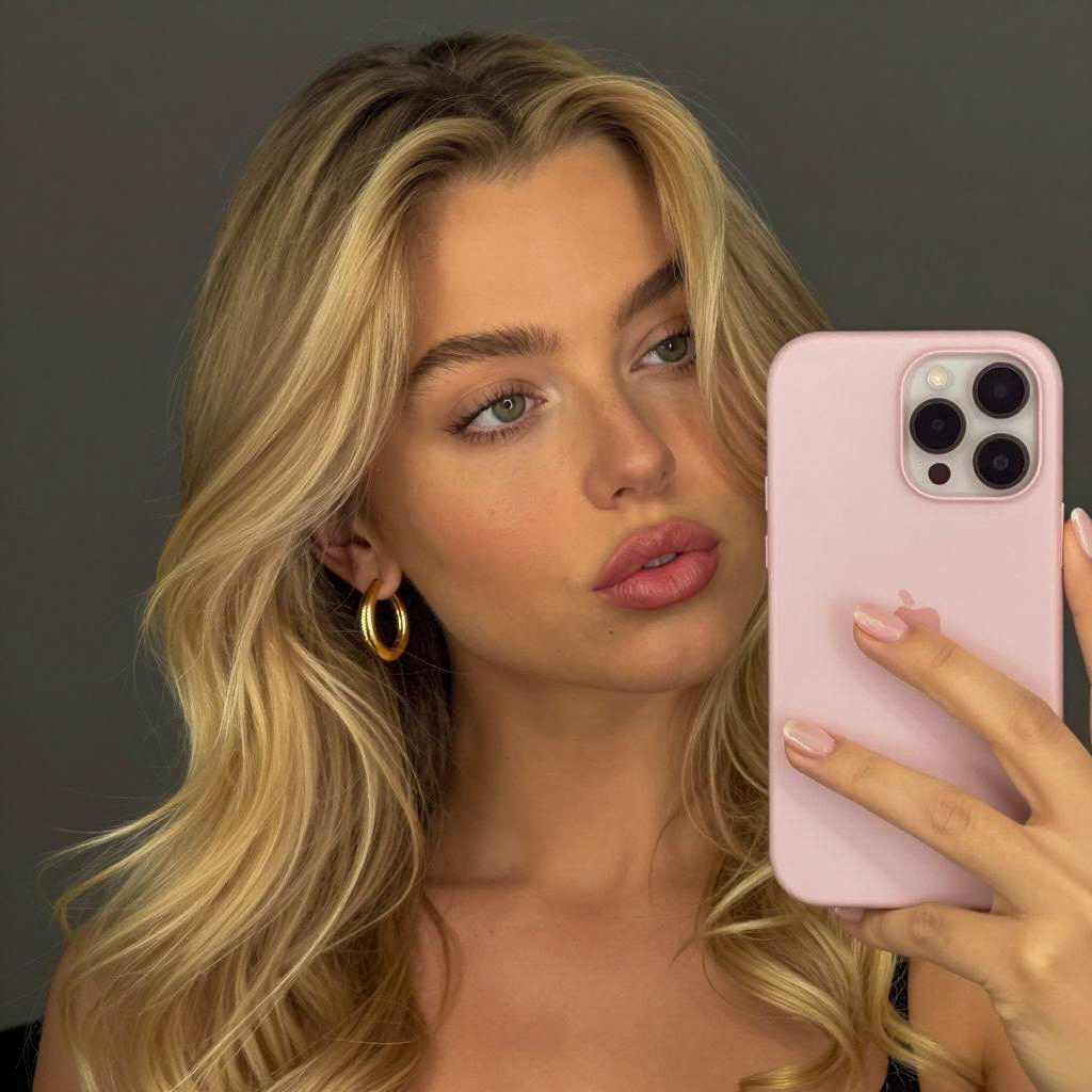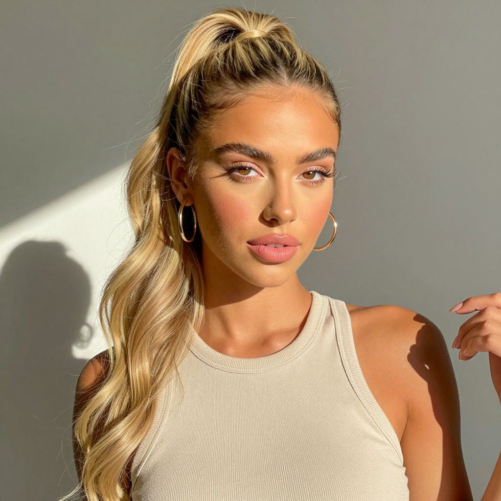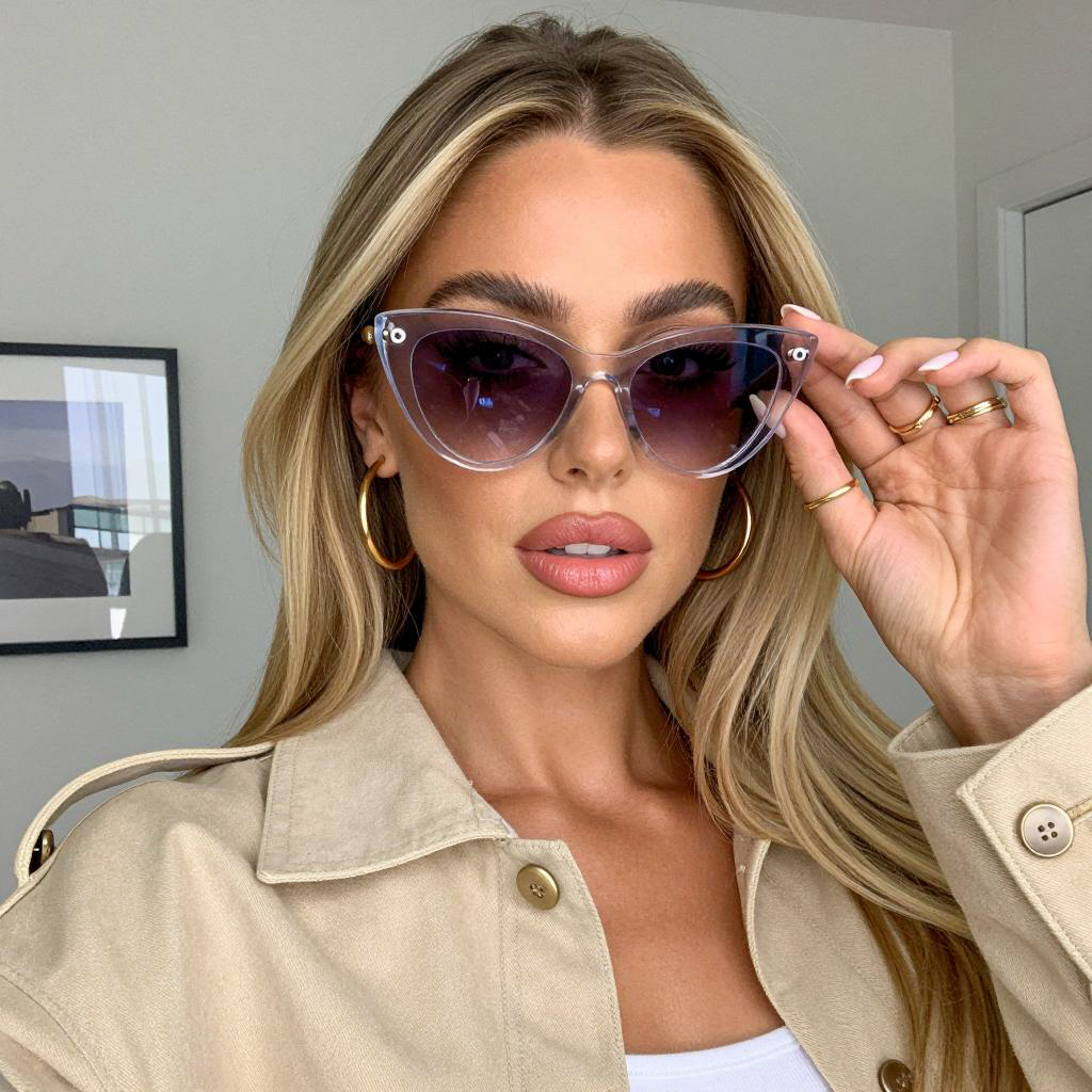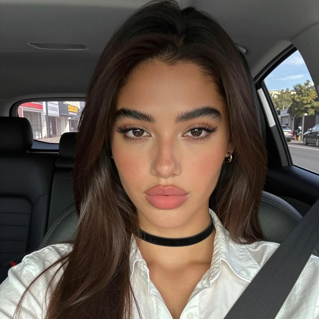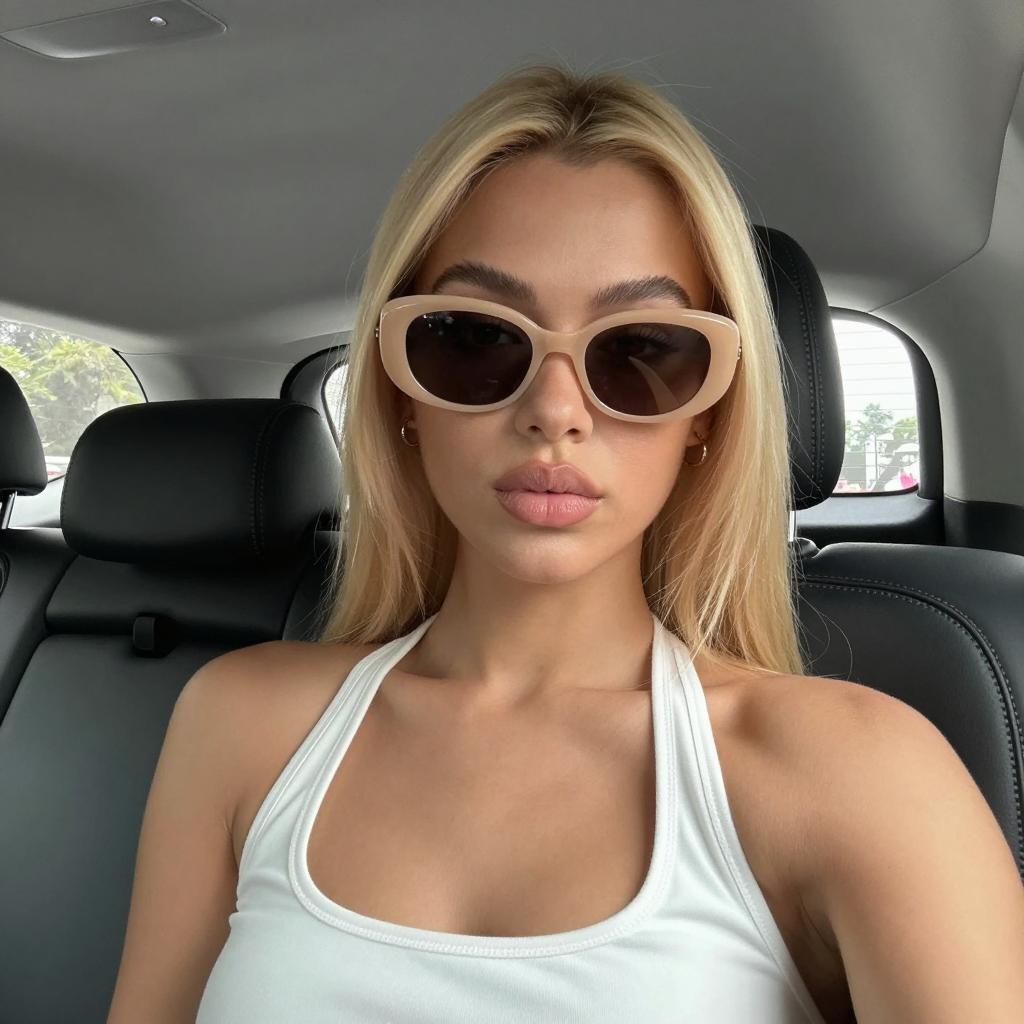 Young woman with light brown skin and straight blonde hair, wearing white halter top and beige sunglasses, inside a car with black leather seats. She has full lips and a neutral expression. Car interior background with a headrest and ceiling light.