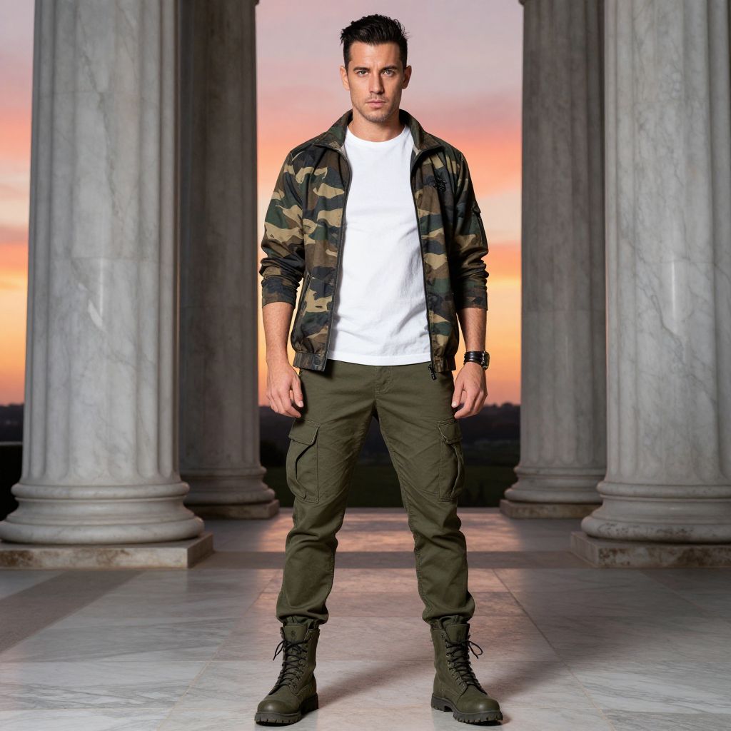 "a man, camo print windbreaker, plain white crew neck shirt, tapered cargo pants, olive green combat boots, leather bracelet, majestic marble columns, vibrant sunset backdrop, cinecolor, confident expressionMan has masculine face and piercing eyes"