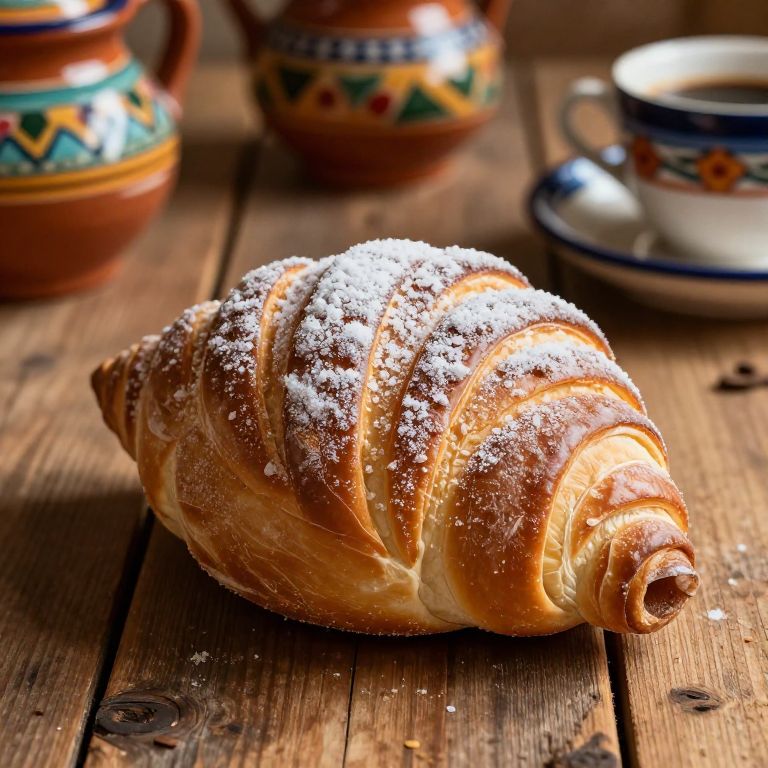 Concha, a traditional Mexican sweet bread with a shell-like pattern, resting on a rustic wooden table, warm morning light highlighting its sugary topping, surrounded by colorful pottery and coffee cups, cozy and inviting atmosphere, high detail