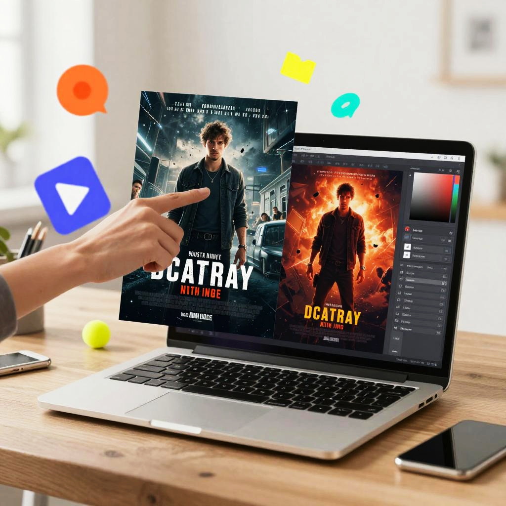 Make a movie poster online free: vibrant digital workspace with user creating a dramatic film poster, colorful graphic design elements floating around, modern laptop screen displaying an easy-to-use poster editor, bright creative atmosphere, high resolution