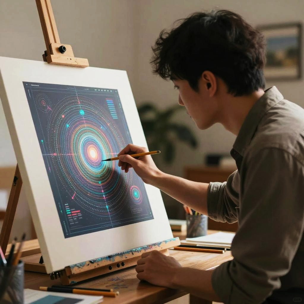 Generate picture with AI emphasizing the fusion of human creativity and artificial intelligence, a person and AI collaborator working together on a complex digital painting, warm tones mixed with cool digital glows, inspiring and imaginative.