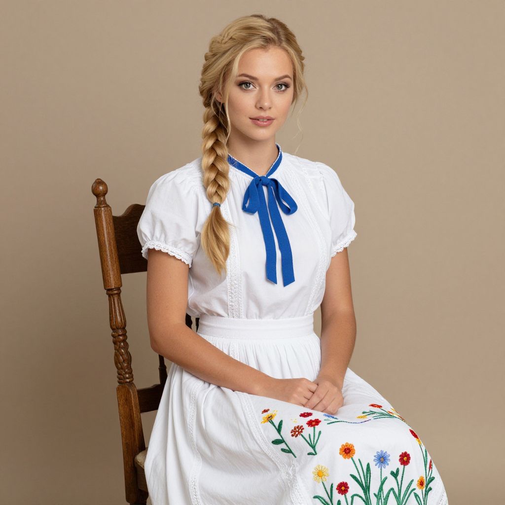 A beautiful young blonde woman with a braided hairstyle is seated on a wooden chair, wearing a white peasant blouse with a blue bow and a skirt embroidered with meadow flowers.