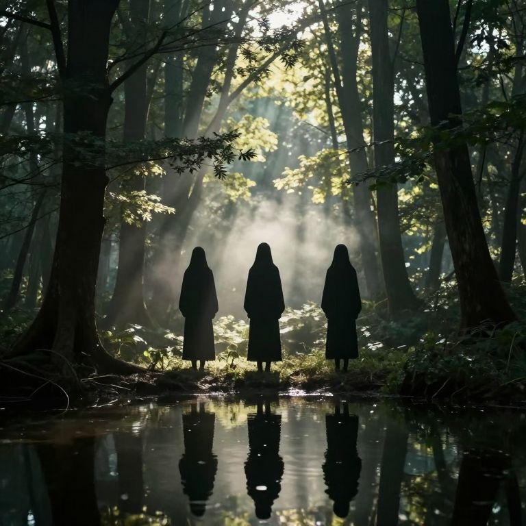 Photograph of a dense forest bathed in ethereal sunlight. Three silhouetted figures, dressed in long, dark robes with hoods, stand side by side on a reflective, puddle-filled path. Sunbeams pierce through the tall, dark trees, creating a mystical glow that highlights the green foliage. The figures are centered, with their reflections visible in the water below. The scene exudes a mysterious, almost magical atmosphere, with the interplay of light and shadow adding depth and contrast to the image.