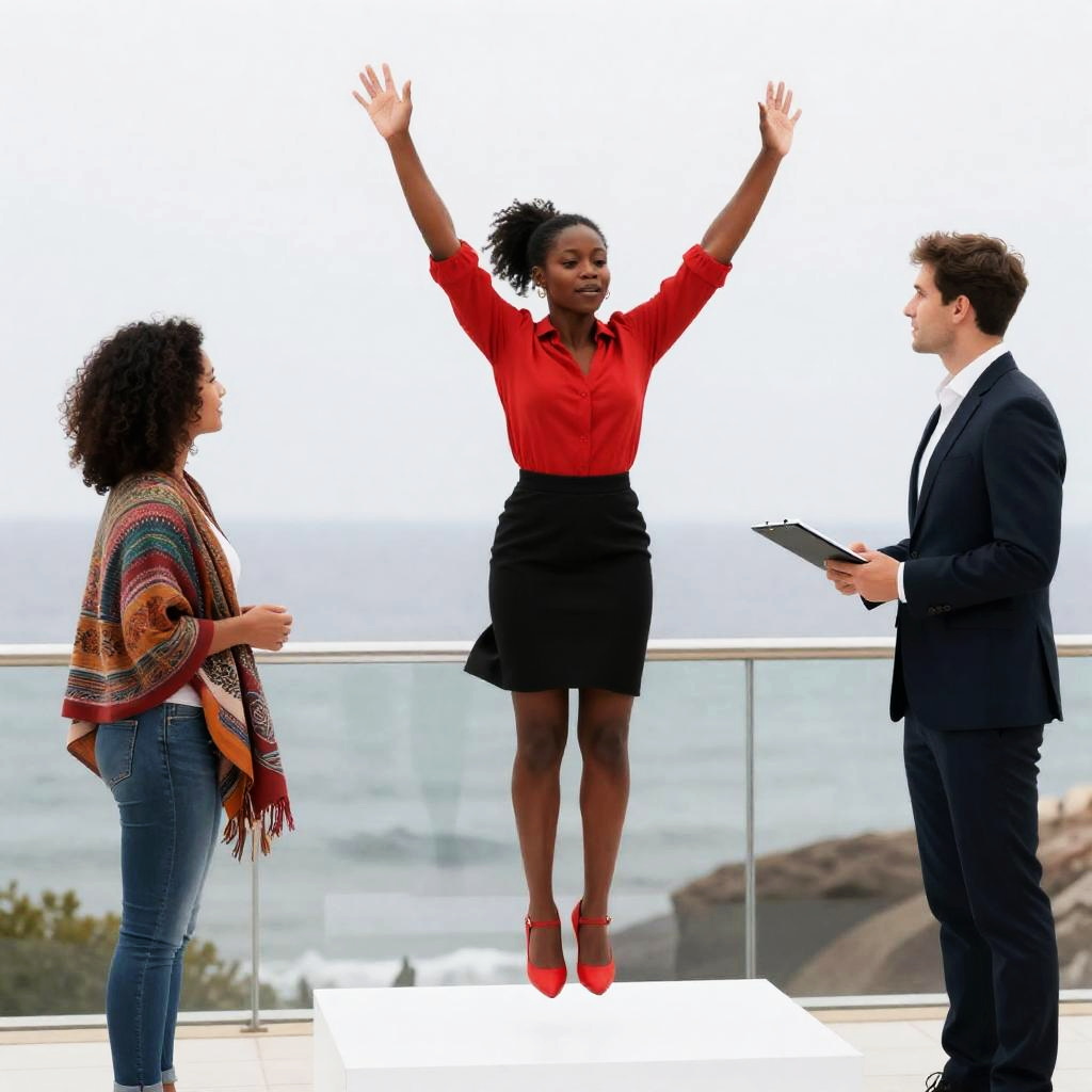 Photograph of three people outdoors near a sea. Central woman with dark skin, black short skirt, red blouse, and red heels, jumping with arms raised on white platform. Woman on left with curly hair, colorful patterned shawl, holding scarf. Man on right in dark suit, holding clipboard, looking at central woman. Background: glass fence, sea, and sky.