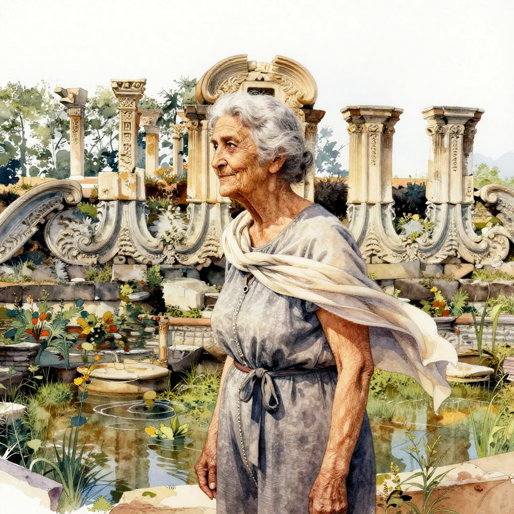 Serene elderly woman knitting by fireplace by cozy rustic cabin interior evening, rendered in warm traditional oil painting; flickering firelight casting soft glow, wool textures detailed, calm ambiance, rich warm tones, inviting scene, intimate focus, homely details, gentle shadows, timeless warmth