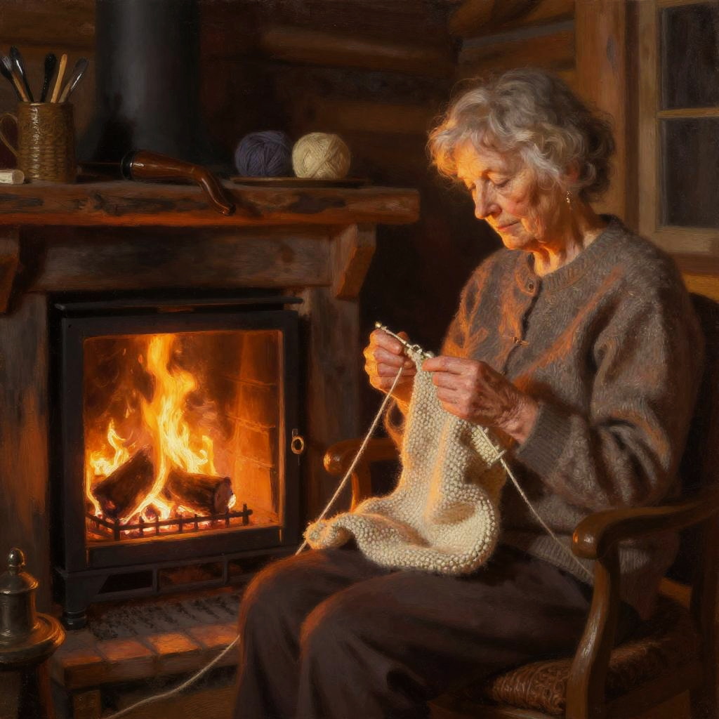 Traditional oil painting of a serene elderly woman knitting by a warm, flickering fireplace inside a cozy rustic cabin. The scene features rich warm tones, soft glowing firelight, detailed wool textures, and homely interior elements including a wooden chair and mantle with yarn balls and pipe. The woman's gray hair and textured sweater add to the intimate and timeless ambiance.