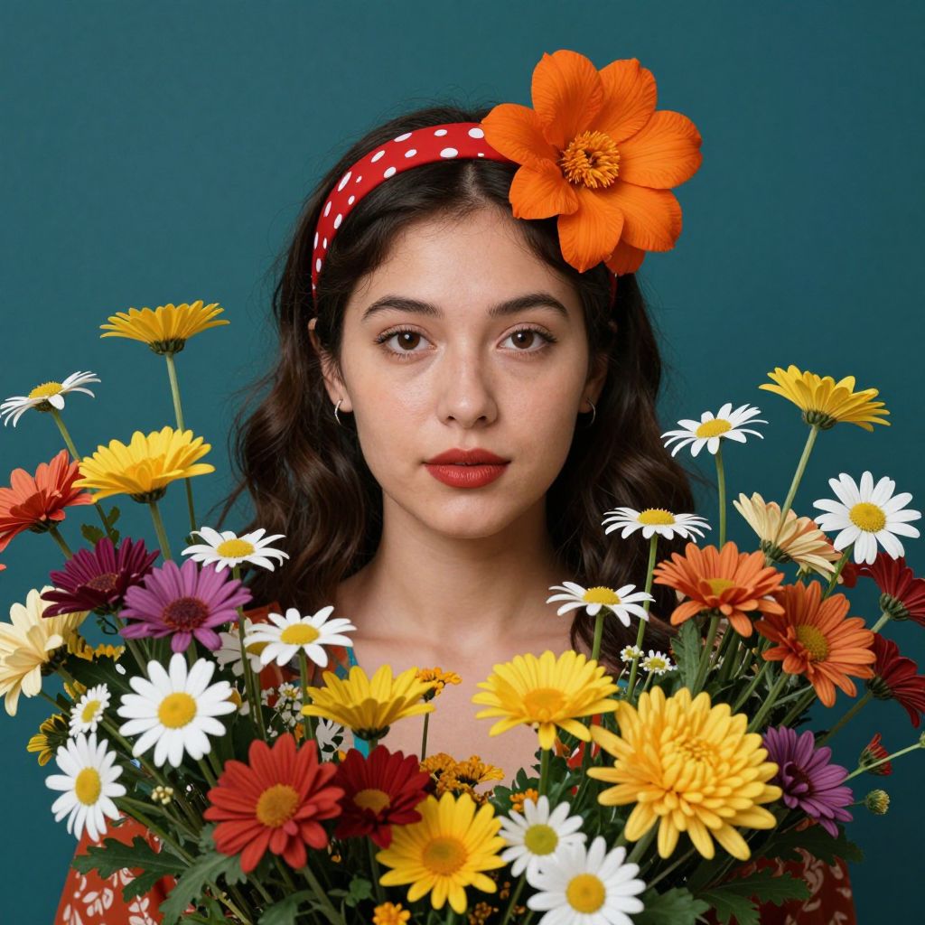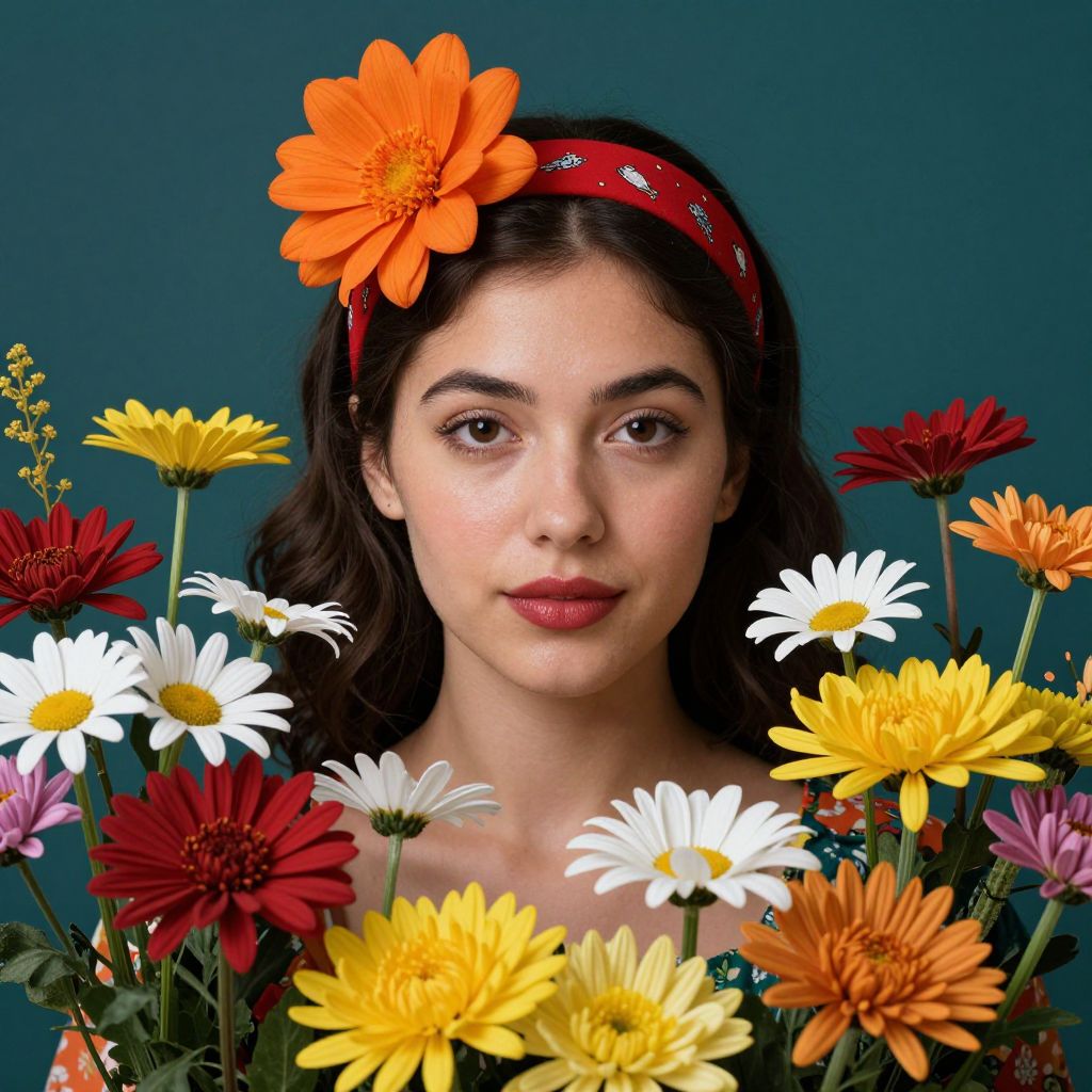 Vibrant portrait of a woman adorned with a red headband featuring a large orange flower, surrounded by a lush array of colorful blooms including daisies and chrysanthemums, set against a deep teal background.