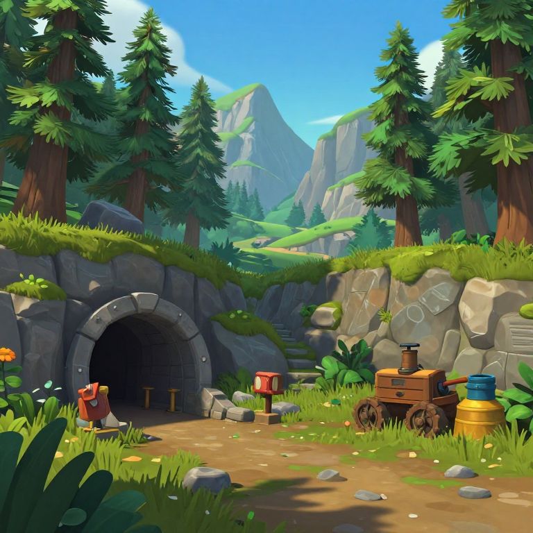 Digital artwork of a mountain pass featuring tall pine trees, an open mine entrance built into rocky terrain, and mining work equipment. The scene includes a mailbox, grassy pathway, and distant mountains under a clear blue sky, evoking a peaceful yet industrious atmosphere.