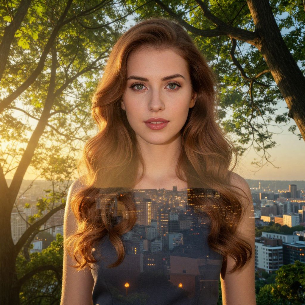 Create a captivating double exposure portrait showcasing a vibrant young woman with cascading chestnut locks amidst an active cityscape at dusk. Her warm and intelligent visage, adorned with high cheekbones, full lips, and emerald eyes sparkling under the soft light of sunset, is framed by a simple yet elegant dress that gracefully complements her figure. Overlaying this scene is an abstract forest at dawn, a serene contrast to the urban backdrop, featuring luminous greens and golds merging softly with city lights. Emphasize the interplay between the woman's features and the intertwining branches, leaves, and dappled light from the forest imagery, evoking a harmonious connection between nature and civilization.