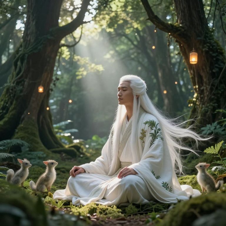 Leaj as a wise sage meditating in a lush enchanted forest glade, soft beams of sunlight piercing through giant trees, surrounded by floating lanterns and delicate woodland creatures, long white hair flowing, robes embroidered with nature motifs, peaceful and magical ambiance.