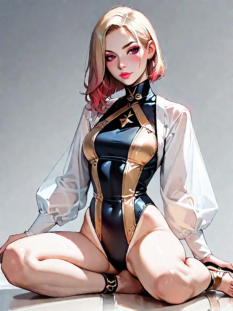 Realistic digital illustration of a young woman with black and red ombre bob haircut, wearing a shiny black plunge neck swimsuit with cut-out sides and gold accents. She is seated on a tiled floor, draped in a soft white sheer mesh cover-up with long sleeves and open front. The woman also wears strappy black sandals with tan leather and flat soles, along with gold jewelry including rings, a choker, and earrings. The image highlights smooth, glossy skin and a modern, stylish summer look.