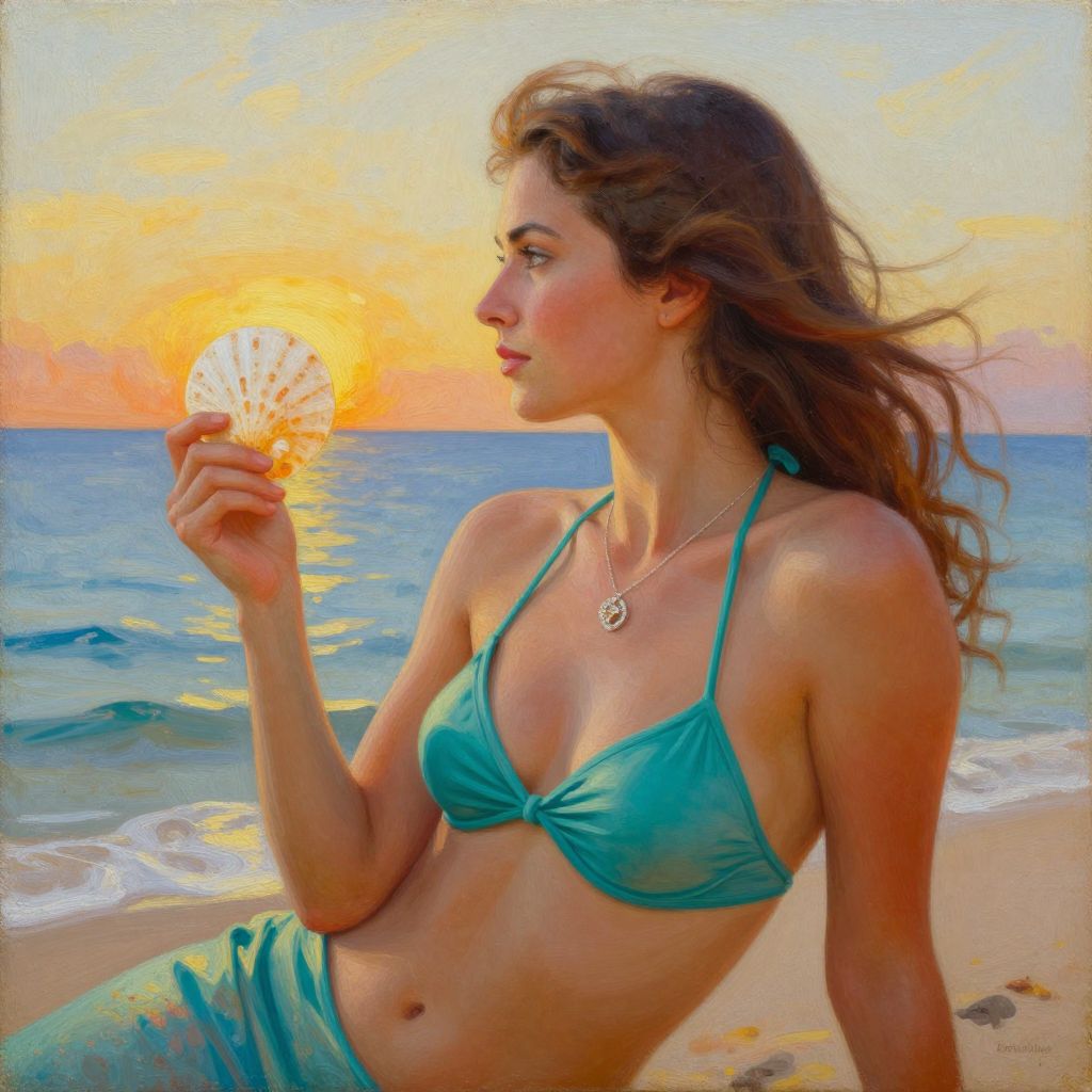 A full-body blonde woman with a short hairstyle, wearing a floral dress, stands amidst palm trees, overlooking a serene beach in Bali, depicted in an unframed oil painting.