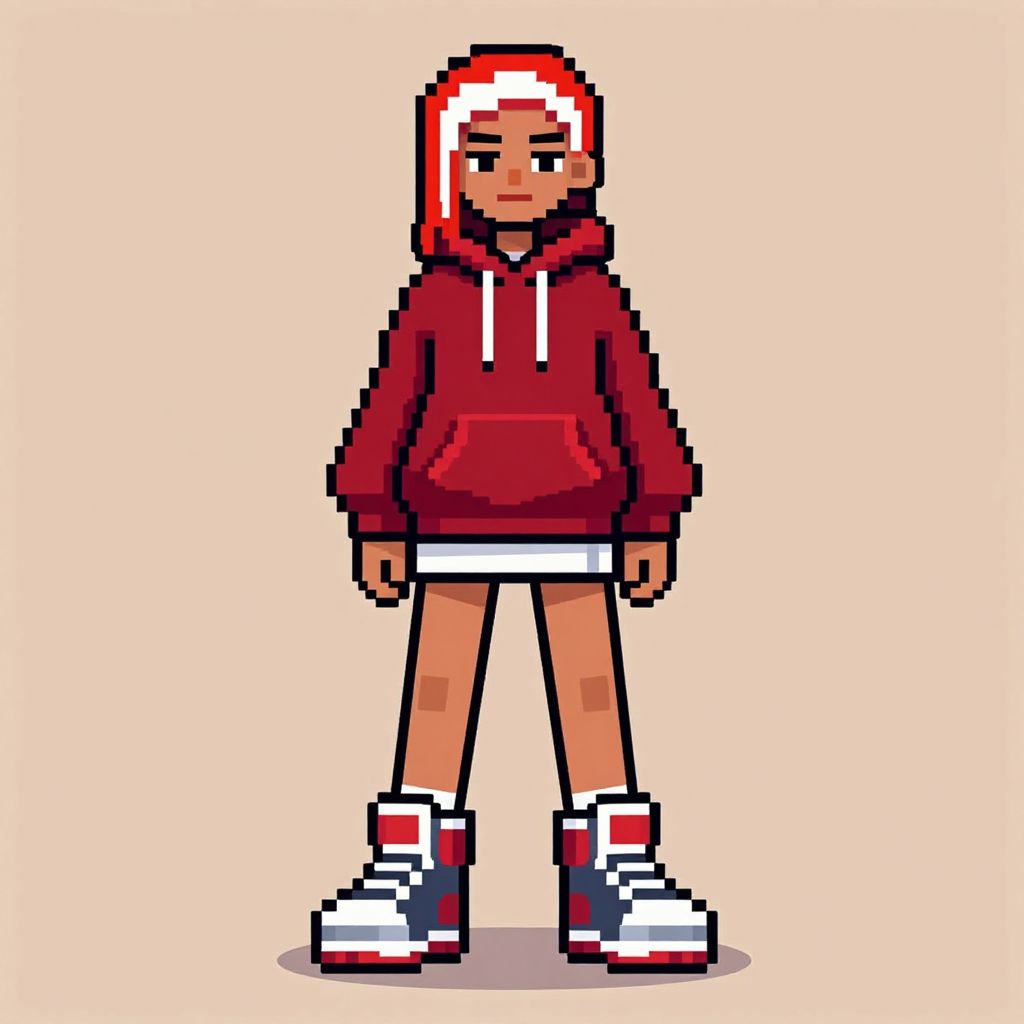 Retro Look a character pixel art full body, woman, red and white dyed shot hair, hoodie, basketball boots,