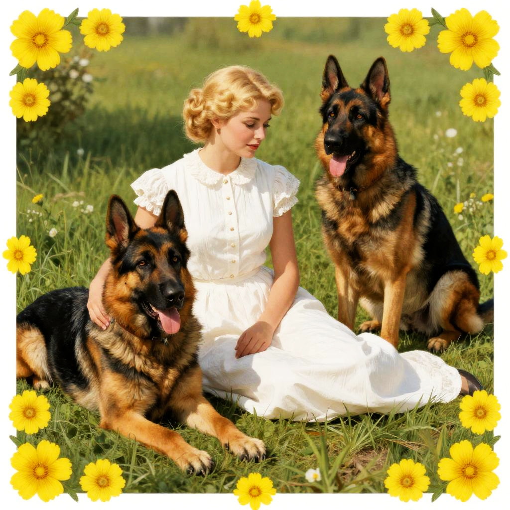 Vintage illustration of a blonde woman in a white dress sitting on grass, with two German Shepherd dogs. One dog lies beside her, the other sits in the background. Woman gazes down, dogs look at her. Yellow floral border frames the scene.