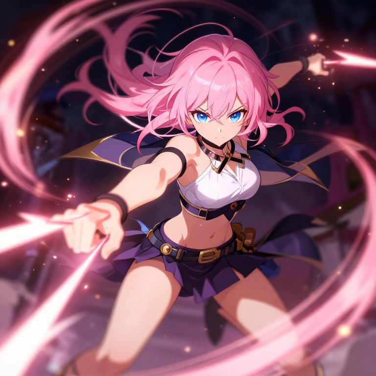 Pink hair and blue eyes anime-style heroine in dynamic battle pose, energy shards swirling around, dramatic lighting with sparks and motion blur, detailed character design, vibrant colors, action-packed composition