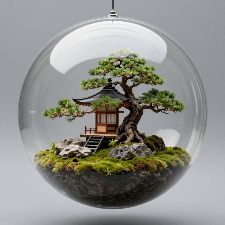 A miniature Japanese garden suspended in a transparent sphere, where a serene pagoda, bonsai tree, and moss-covered rocks coexist in perfect harmony, defying the boundaries of scale and reality.