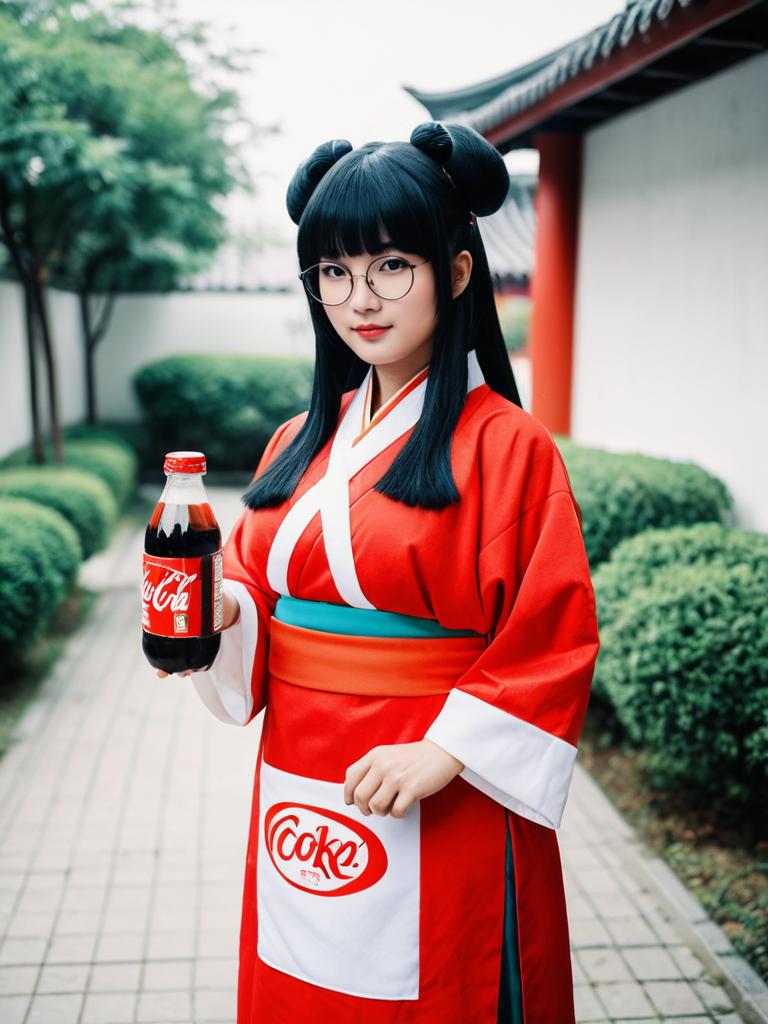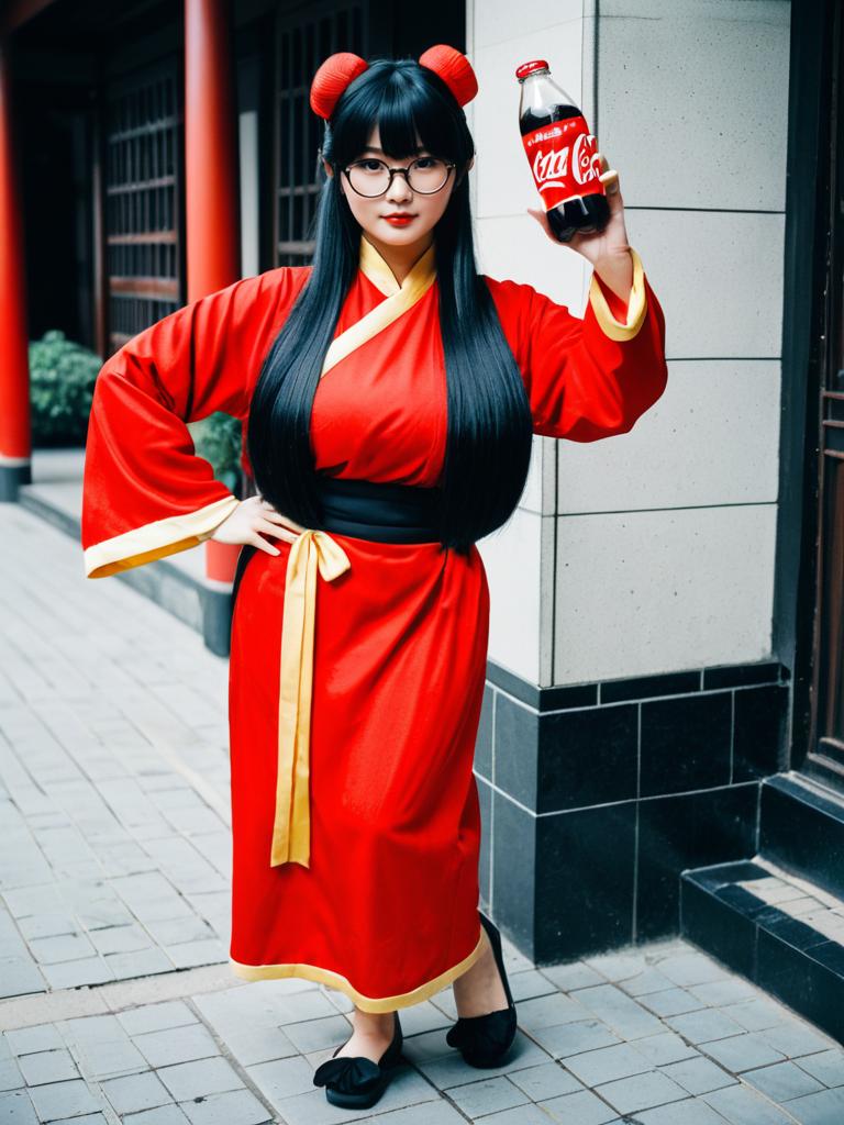 Photo-realistic cosplay photo of person in mousse (ranma 1/2) costume. Full body. Standing. Full length. 1girl, coke-bottle glasses, eyewear on head, long hair, black hair, blunt bangs, huge breasts, chinese clothes, chinese clothes