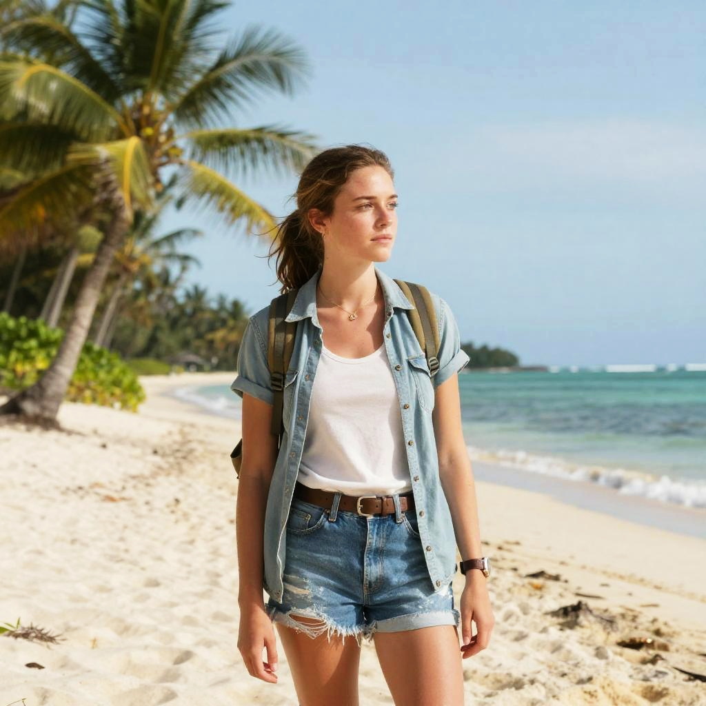 Evangeline Lilly as a young explorer on a tropical island beach, casual clothes, bright sunny day, palm trees swaying, realistic style with natural color palette, serene mood