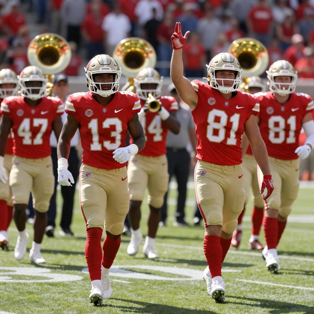 Photograph of three male football players in red and white uniforms. Central player with number 16, holding silver helmet, looks forward with a neutral expression. Player to left, number 8, smiles. Player to right, number 59, looks ahead. Stadium background with spectators. Green field. Players have dark hair, muscular builds.