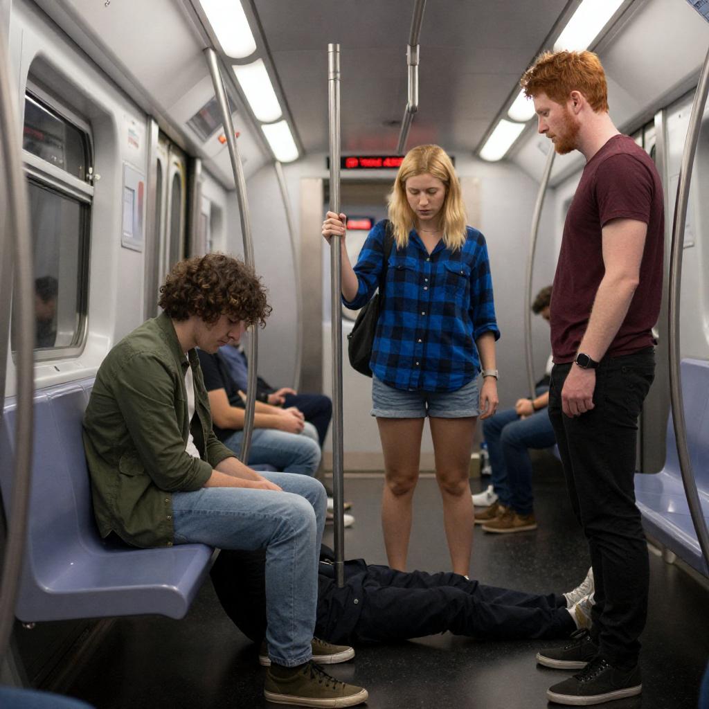 Photograph of a chaotic subway scene: a curly-haired man in a green jacket and white shirt sits on a gray seat, while a blonde woman in a blue plaid shirt and shorts stands, holding a pole, as a red-haired man in a maroon shirt and black pants looks on. A person in dark clothing is lying on the floor between them. Bright fluorescent lights illuminate the interior.