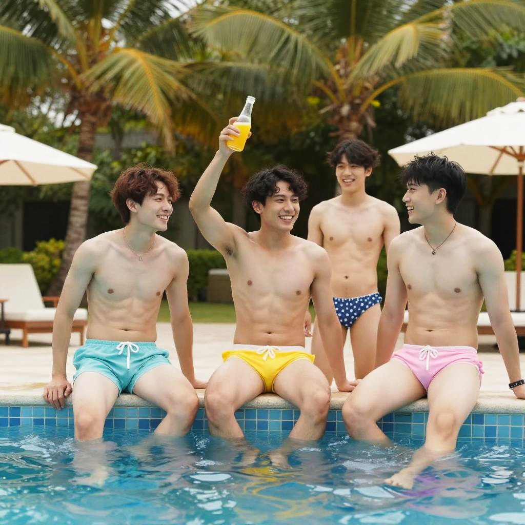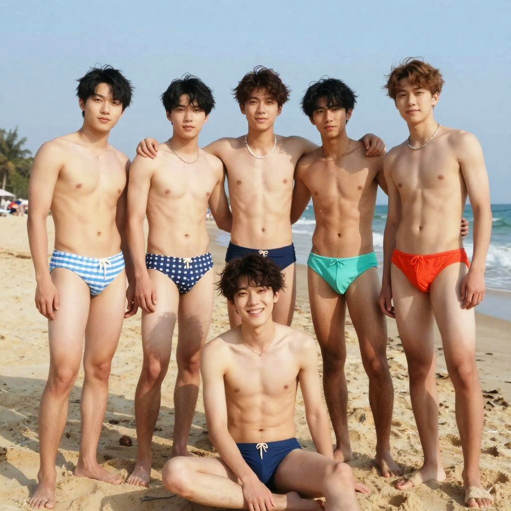 Boys wearing bikinis confidently at a sunny beach, vibrant colors, playful atmosphere, clear skies, detailed expressions, realistic style