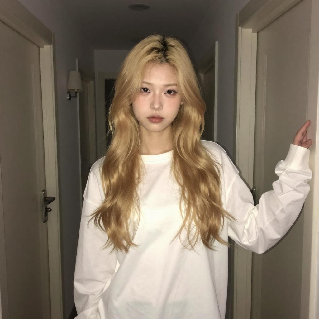 Photograph of a young woman with long, wavy blonde hair standing in a dimly lit hallway. She wears a loose, white, long-sleeved shirt, slightly illuminated by light from behind. The background features white doors with wall-mounted lamps. Her expression is neutral, and she stands with one arm slightly raised.