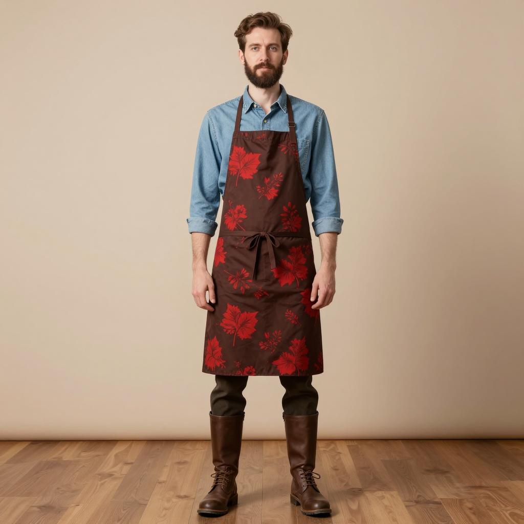 Portrait of a bearded adult man with short hair standing against a beige background. He wears a brown apron with a red floral pattern over a light blue button-up shirt, dark pants, and brown leather boots. The setting features a wooden floor and neutral studio lighting with minimal shadows.