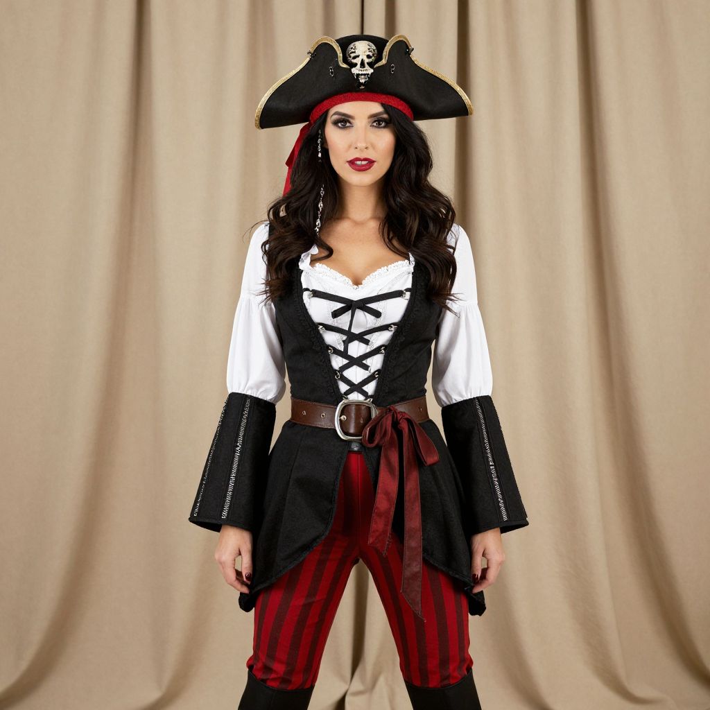 Photograph of a woman dressed as a pirate. She has long, wavy black hair, wears a black pirate hat with a white skull and crossbones, and has bright red lipstick. Her costume includes a white shirt with black lace-up front, black vest, and red-striped pants, held up by a brown belt with a large buckle. She also wears black, puffed sleeves with white trim. The background is a plain, beige curtain. Her confident stance and direct gaze give a sense of pride and character. The overall style is classic pirate, with a touch of theatrical cosplay.