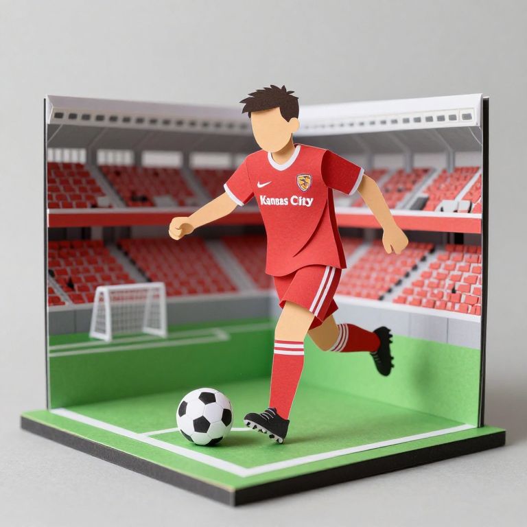 A multi-dimensional paper cut craft diorama of a sporting Kansas City soccer player on a soccer field.