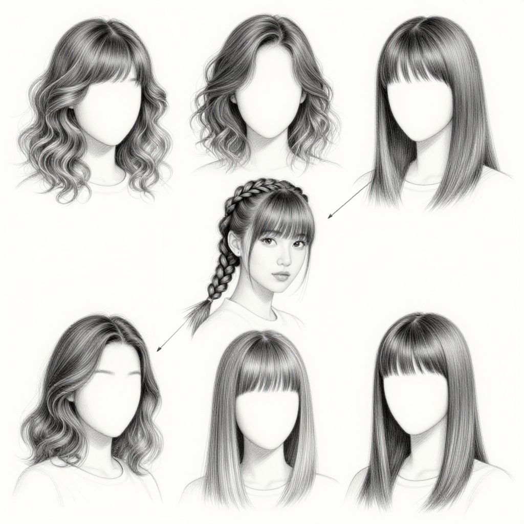 Hair style drawing reference featuring a diverse collection of women's haircuts and textures, drawn in fine pencil sketches with annotations, showcasing layers, curls, braids, and straight styles in a realistic and artistic manner, studio lighting.