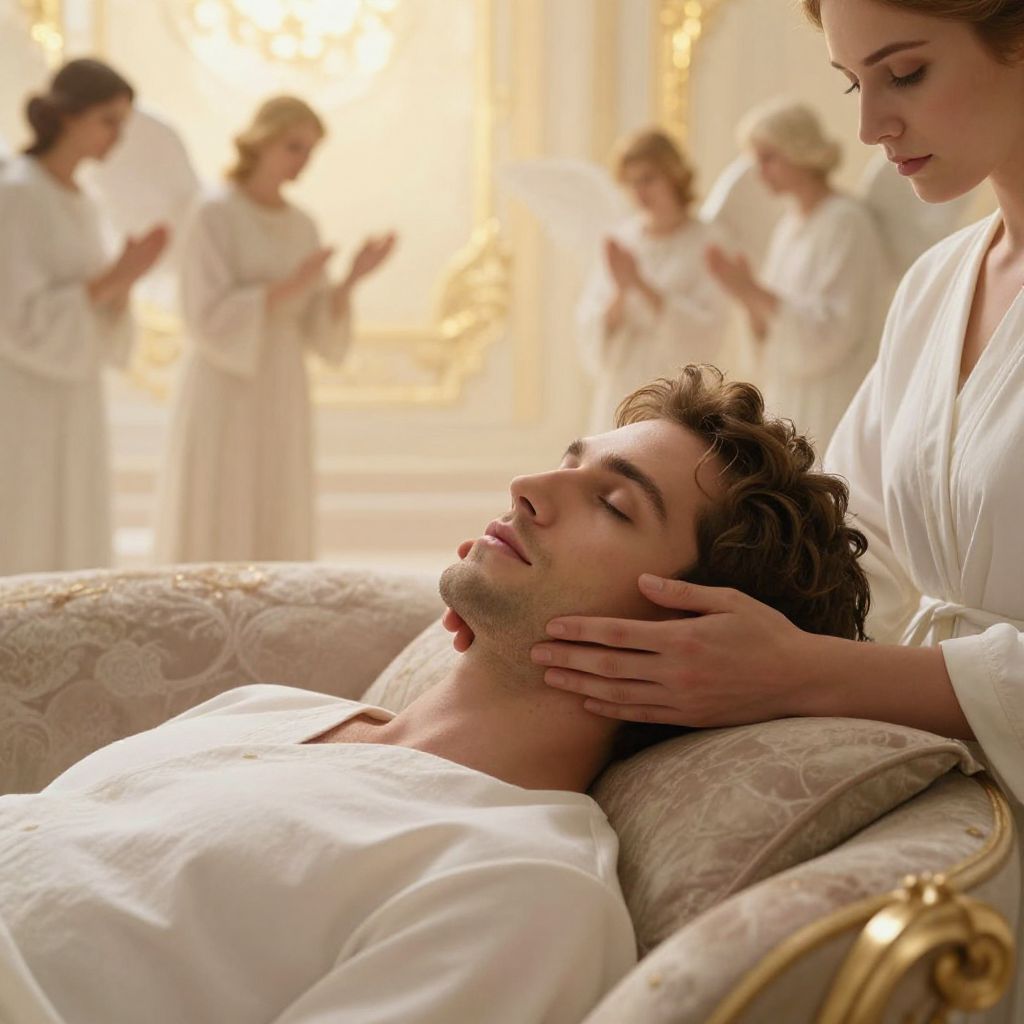 Photograph of a serene indoor scene with a young man lying on a patterned beige couch, eyes closed, wearing a white robe. A young woman with light brown hair, also in a white robe, gently holds his face with both hands. In the blurred background, four other women in white robes stand praying, bathed in soft, golden light. The setting is elegant, with ornate, gold-trimmed walls. The overall mood is peaceful and spiritual.