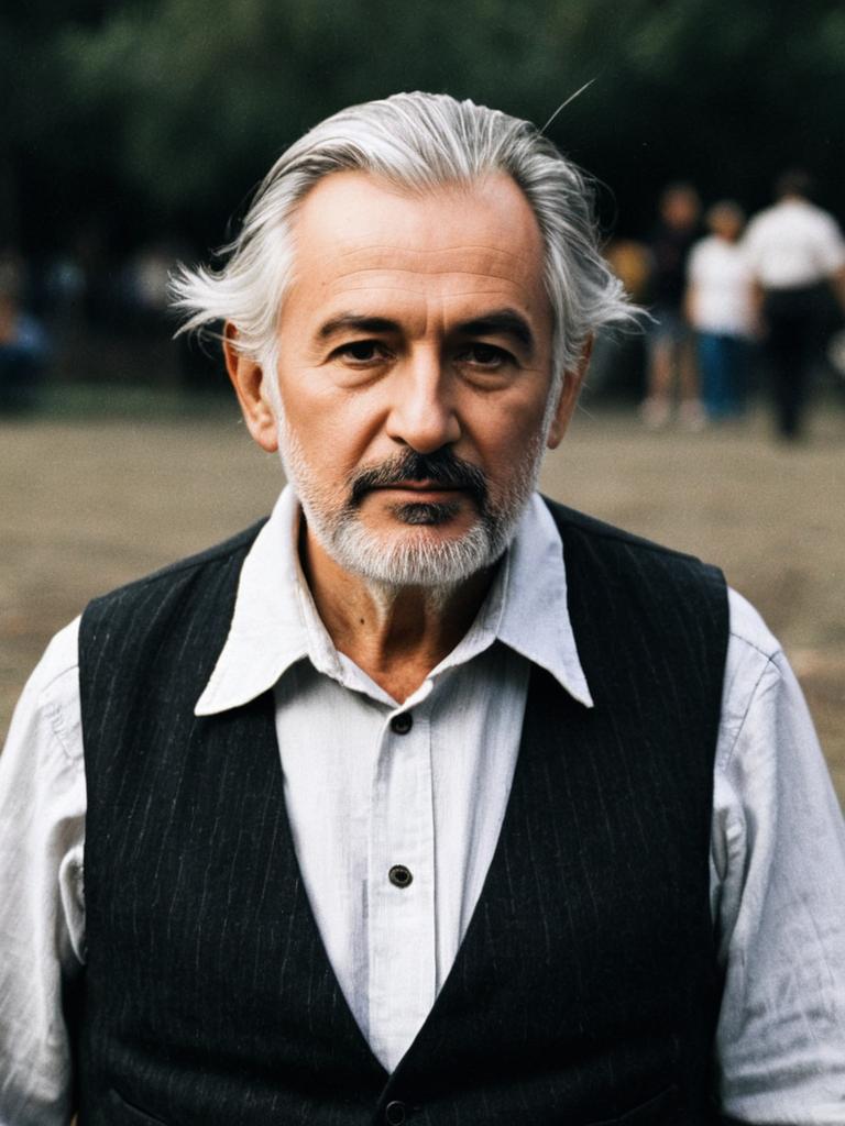 Clothes older costume, male focus, 1boy, vest, old, blurry background, shirt, blurry, old man, looking at viewer, upper body, black vest, realistic, white shirt, solo, grey hair, closed mouth, outdoors
