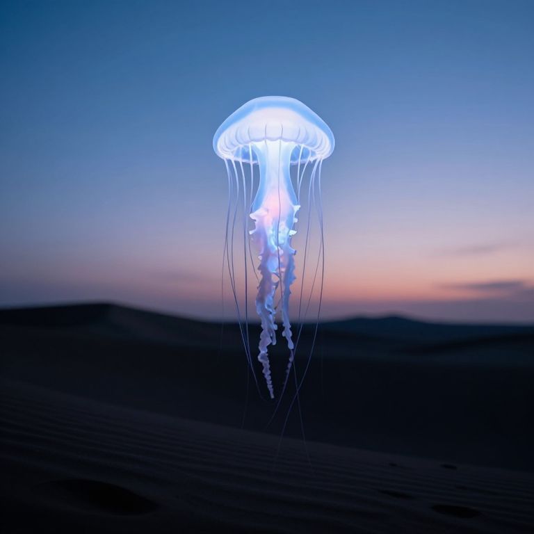 An ethereal jellyfish ascends through the twilight sky, its luminescent glow casting a serene yet otherworldly light over a desolate desert of black sand dunes, evoking a sense of transcendence and the quiet beauty of solitude.
