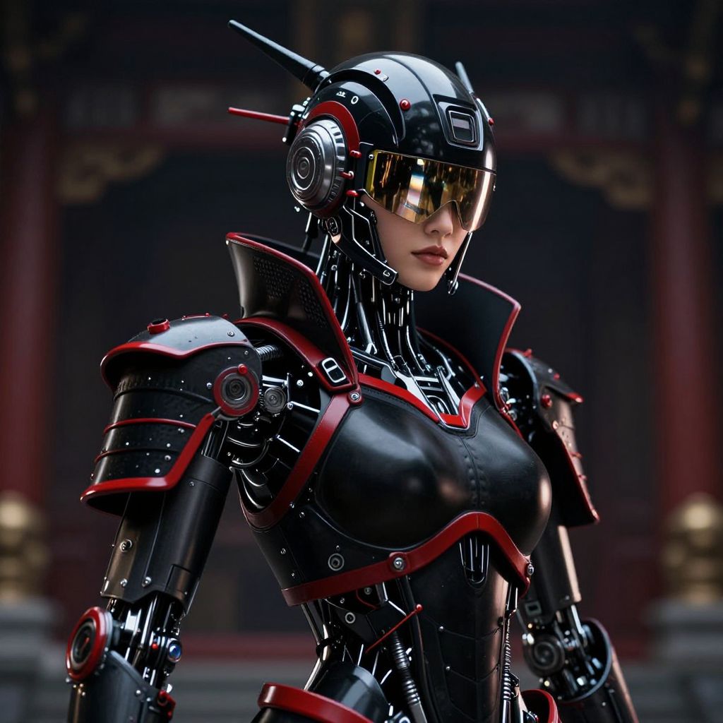 D4rkCyb3rDyn34n1m3 style, photorealistic image of a cyberpunk robot samurai woman in black and red armour, robot face with mirrored face shield reflecting light, hyperdetailed helmet, robot joints and wires, dark abstract background suggesting eastern asian temple